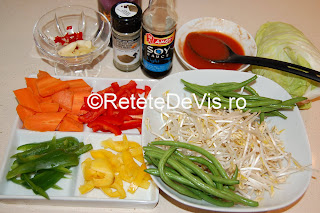 Urmeaza ciupercile Shii Take si ardeii. Acestea se introduc la fiert in acelasi timp (au fost sotate doar un minut fiecare).