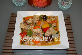 Cand puiul este aproape facut, puneti si celelalte legume si mai lasati totul pe foc 3 minute. In final, morcovul, ceapa si ardeiul trebuie sa aiba o consistenta ferma, deci atentie sa nu le coaceti prea mult.