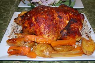 Ungeti din cand in cand puiul cu sosul tomat si cu sosul din tava. E gata in aproximativ 50 de minute, cand legumele sunt coapte si puiul e bine rumenit.