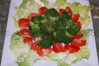 Stropiti buchetele de broccoli cu sos, decorati platoul cu felii de rosii si salata verde.