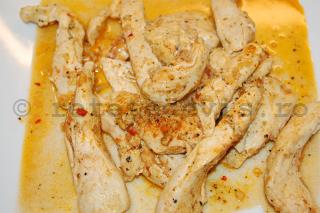 Taiati pieptul de pui in fasii subtiri. Caliti-l in 2 linguri de ulei de masline, impreuna cu usturoiul macinat.