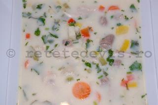 Apoi o varsati in oala cu ciorba, amestecati pana cand se omogenizeaza bine. Gustati si potriviti de sare, piper, lamaie. Daca doriti un gust mai bogat, adaugati si 100 ml smantana lichida si mai fierbeti la foc foarte mic inca 2 -3 minute.