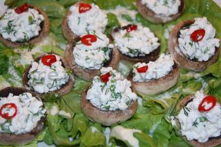 Ciupercile coapte sunt foarte gustoase, iar combinatia cu perlele de branza dulce este foarte racoritoare si parfumata de amestecul de verdeturi proaspete.