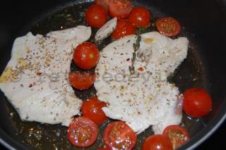 Si gata! Opriti focul, asezati fileurile pe o farfurie intinsa, decorati farfuria cu rosiile cherry coapte si sosul de ulei de masline, lime, rosii si condimente.