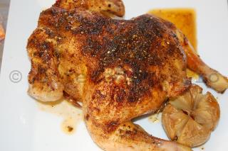 Presarati din belsug pe toate partile puiului: sare, piper proaspat macinat cu petale de trandafir, galbenele, lavanda si albastrele(flori de afin), coriandru macinat, boia de ardei iute.