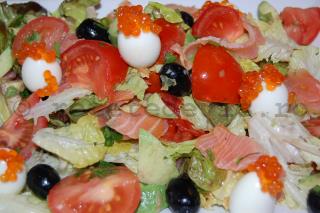 Salata pe care v-o propun incearca sa aduca putina fantezie in privinta modului de servire a caviarului: ouale de prepelita fierte, reci sunt un "suport" interesant pentru pretioasele oua de somon.