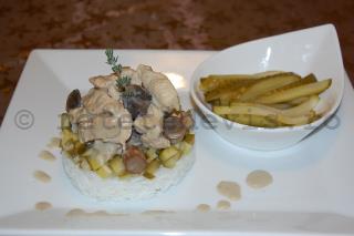 Garnitura folosita este orezul fiert sau cartofii prajiti. Eu, evident ca va recomand orez fiert (e mai elegant si mai sanatos).