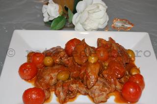 Ficateii de pui sunt foarte potriviti pentru cina, deoarece se prepara foarte rapid si sunt foarte gustosi. Reteta de azi va aduce o combinatie mediteraneeana de masline verzi, umplute cu migdale, si rosiile cherry, renumite pentru dulceata lor.
