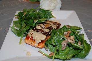 Aceasta combinatie sofisticata si eleganta este o explozie de principii nutritive foare sanatoase. Somonul, spanacul proaspat si fraged, nucile, lamaia, sosul de soia si pasta de susan creeaza o combinatie menita sa va revigoreze, sa va imbunatateasca starea de sanatate si aspectul pielii. Prepararea termica este extrem de redusa, astfel incat somonul va ramane suculent si fraged, iar restul ingredientelor sunt folosite in stare naturala, pentru a ajuta cat mai mult procesul de detoxifiere al organismului.