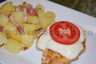 Ca garnitura, puteti alege cartofi la cuptor sau cartofi taranesti si salata de rosii cu castraveti.