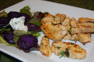 Puiul tras la tigaie cu ierburi aromatice si condimente picante este o reteta usoara pentru o cina rapida. Alaturi de o salata de cartofi albastri , cateva frunze verzi de salata si un sos de branza si ierburi aromatice, aveti un meniu colorat si apetisant.