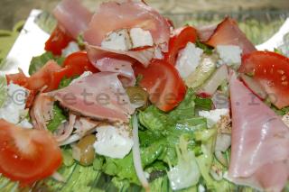 Aranjati salata pe platouri, decorati cu jambon, feta si felii de rosii proaspete .