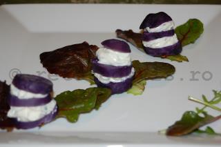 Turnuletele de cartofi cu crema de brana sunt un antreu simplu, dar festiv. Alaturi de o salata verde asortata, poate fi o cina completa, mai ales daca sunteti la dieta. Cartofii albastri sunt ideali pentru aceasta combinatie, dar , daca nu aveti, puteti sa-i folositi si pe cei clasici.