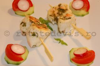 Ungeti tepusele cu putin ulei (ca sa se scoata mai usor carnea). Taiati somonul in cuburi si fileul de sole in fasii. Infasurati fiecare bucata de somon in fasii de sole si infingeti rulourile pe tepuse.