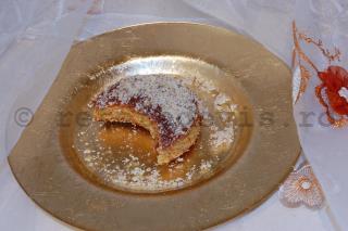 Ca sa obtineti forma de semiluna, taiati prajitura cu un pahar. Se serveste dupa ce s-a racit bine.