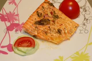 Spalati fileul de somon, ungeti o tava cu putin ulie de masline si asezati fileul frumos in tava. Presarati sare, piper, ardei iute, menta proaspata tocata si putin busuioc proaspat (merge si din cel uscat, dar ierburile aromatice proaspete dau un plus de savoare). Stoarceti o lamaie peste somon, adaugati cateva felii de usturoi, putina apa si dati tava la cuptor la 180 de grade.