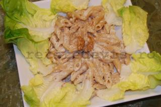 Fierbem "al dente" aprox. 200 gr penne (adica sa ramana putin tari), le scurgem si le clatim cu apa rece. Apoi ne apucam de sos.
