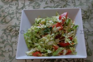 Reteta este simpla: spalati, tocati fin varza. Frecati-o putin cu sare. Adaugati ulei de masline si suc de lamaie , dupa gust. In final, cateva felii de rosii vor colora frumos varatica salata. Daca va place gustul de marar, nu ezitati sa adaugati putin si in aceasta salata, care abia asteapta inca un detaliu aromatic.