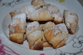 Derulati foaia de aluat fraged. Taiati-o in triunghiuri radiare. Umpleti fiecare triunghi cu rahat (sau gem , nuca, etc) si rulati-l dinspre baza spre varf.