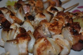 Pentru astazi va propun o combinatie foarte reusita: frigarui de piept de pui cu costita afumata.