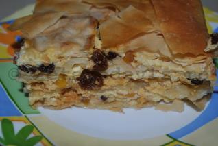 Continuati la fel, cateva foi, apoi un strat de crema, pana cand terminati compozitia. La final, puneti 3-4 foi de placinta. Ungeti-le cu foarte putin ulei.