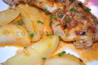 Adaugati si cartofii taiati felii. Introduceti iar tava in cuptor si mai lasati-o aprox. 30 de minute, pana cand cartofii sunt facuti si carnea rumenita.