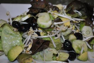 Rupeti salata cu mana si asezati-o pe un platou. Apoi distribuiti feliile de avocado, de castravete, fasolea mungo, cateva masline negre fara samburi.