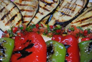 Cateva felii de vinete si ardei grilate, un sos rapid de legume proaspete, pe baza de ulei de masline extravirgin si suc de lamaie, pot fi o solutie rapida si sanatoasa pentru o cina de vara.