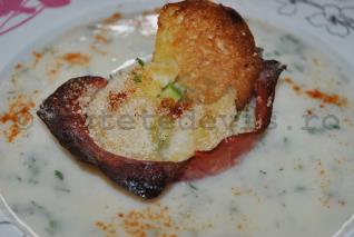 Puneti doar un polonic de supa in farfurie, apoi asezati feliile-crutoane aromate (ele vor pluti deoarece sunt foarte crocante si se imbiba greu cu supa). Peste feliile de paine, asezati minunata delicatesa cu jambon, sparanghel si mozzarella.