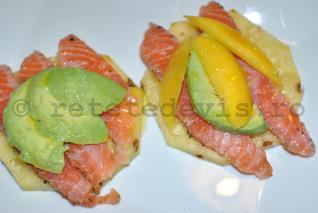Curatati ananasul si taiati-l in rondele. Feliati somonul si stropiti-l cu suc de lime sau de lamaie.