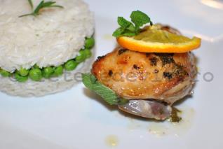 Va propun o combinatie deosebita, ideala pentru mesele de sarbatori (si nu numai), care spune "stop" frigului si amortelii specifice anotimpului rece. Puiul cu portocale, miere si menta proaspata nu este doar o reteta culinara, ci si o reteta de bunadispozitie, aspectul sau colorat si festiv fiind destinat sa creeze bucurie privirii si rasfat papilelor gustative. Cromatica optimista de portocaliu cu verde, aroma care te trimite cu gandul la Craciun, dau o nota vesela meniului, dar si invitatilor vostri. Atunci cand folositi aromoterapia culinara veti avea surpriza placuta de a observa cum se incalzeste atmosfera si apar zambete pe fetele invitatilor.