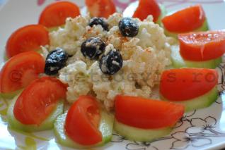 Reteta este simpla, rapida si de efect. Spalati, desfaceti conopida in buchetele, si fierbeti-o in apa cu sare, 10 minute. Apoi o scurgeti si o amestecati asa fierbinte cu crema de branza (cu piper, cu ierburi sau simpla), putina smantana, sare (dupa gust), putin usturoi macinat (optional). Presarati si cateva masline si gata.