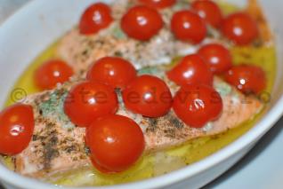Presarati generos ierburi provensale. Taiati in jumatati cateva rosii cherry bine coapte si asezati-le cu sectiunea peste somon. Astfel vor ramane suculente si nu se vor usca. Plus ca vor lua o aroma incredibila de usturoi si de ierburi provensale.