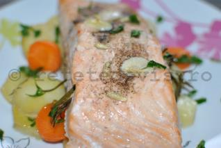 In poza, garnitura este formata din cartofi copti cu rozmarin si morcovi fierti la aburi. Merge foarte bine cu felia de somon. Puteti sa fiti si mai dietetici, sa serviti doar cu salata verde.