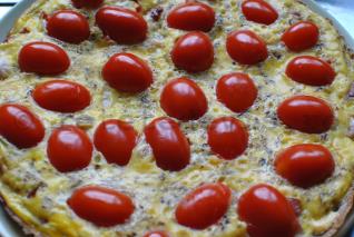 Se bat bine 4 oua, se amesteca cu o lingurita de oregano uscat. Caliti sunca taiata cubulete intr-o lingura de ulei de masline, turnati ouale batute si reduceti focul la mediu. Puneti un capac. Frittata se va umfla si nu se va arde. Cand e aproape facuta, adaugati rosiile cherry taiate in jumatati.