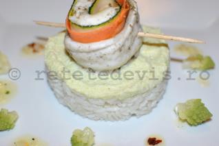 Pe o fasie de peste asezati cate o fasie din fiecare leguma, rulati si prindeti cu o scobitoare sau o tepusa de lemn.