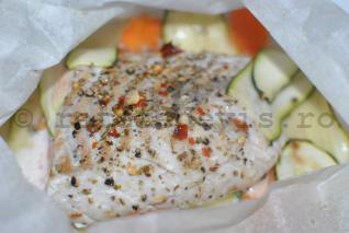 Ungeti cu ulei un dreptunghi mare de hartie de copt. Asezati alternativ fasii subtiri de legume (morcov si zucchini) si presarati sare. Peste legume puneti bucata de peste. Stropiti-o cu suc proaspat de lamaie. Presarati sare, oregano uscat si piperul macinat (puteti sa puneti si cativa fulgi de chilli).