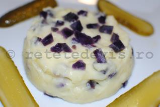 Se toaca cubulete cartofii albastri si se amesteca cu piureul.