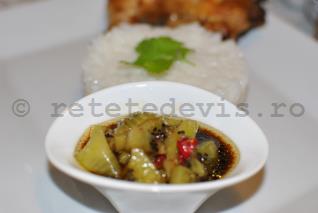 Curatati kiwi de coaja, tocati-l cubulete. Tocati un ardei iute foarte marunt (daca e foarte iute, e bine sa nu puneti si semintele pentru ca va fi deja prea mult, plus ca nu sunt prea placute la gust). Amestecati totul cu sos de soia, ulei de masline si zeama de lamaie. Sare nu e nevoie sa puneti pentru ca e deja sarat sosul de soia.