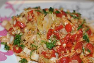 Varza calita la cuptor este delicioasa, iar combinatia cu ardei grasi rosii si marar proaspat ii da un plus de gust si un aspect vesel si atragator.