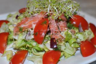 Salata de legume, somon si germeni de broccoli este foarte delicioasa si hranitoare. Daca nu va place pestele, puteti sa il inlocuiti cu piept de pui la gratar, rezultatul va fi la fel de bun.
