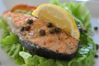 Somonul se lasa pe grill inca un minut dupa ce opriti focul, timp in care il stropiti iar cu putin suc de lamaie. Se serveste cald, presarat cu capere si decorat cu o felie de lamaie.
