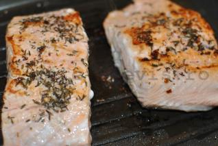 Incingeti grill-ul si asezati feliile de somon cu pielita in jos. Condimentati somonul cu sare, piper, ardei iute, cimbru uscat, usturoi deshidratat.