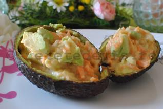 Avocado se taie in jumatati, se indeparteaza miezul si se scoate pulpa. Se stropeste imediat cu suc de lamaie, ca sa nu se oxideze, se taie in cuburi. Morcovul si marul se rad si se stropesc cu suc de lamaie.