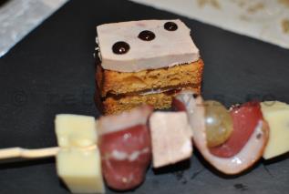 Se ordoneaza apetisant cubulete de cascaval sau swaitzer , pastrama de piept de rata cu strugure si cubuletul de foie gras in mijloc.