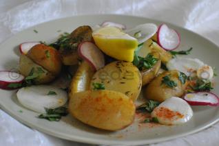 Cartofii fierti se taie felii si se trag la tigaie in foarte putin ulei de masline, cateva minute. Daca sunt cartofi bio, netratati, pastrati si coaja. Apoi se aseaza pe farfurie , se presara cu sare, piper, boia. Adaugati rondele proaspete de ridichi si ceapa. Stropiti cu suc de lamaie. Presarati patrunjel tocat (daca doriti mai aromata salata, adaugati si oregano si busuioc proaspete , tocate). Decorati cu o felie de lamaie si serviti imediat.