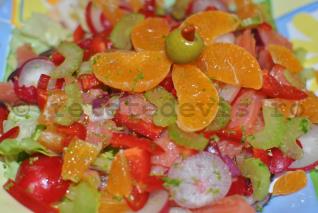 Clementinele se taie bucatele, se adauga peste salata. Se taie in felii subtiri un sfert de tija verde de telina si presaram peste salata. Vine si un ardei rosu ( am gasit toate legumele bio, chiar daca era iarna, si sunt sigura ca au fost pline de vitamine, pe langa gustul minunat pe care il aveau).