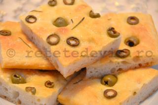 Se lasa aluatul sa mai creasca in tava inca vreo 15-20 de minute. Apoi se presara cu sare grunjoasa, rozmarin si se introduc masline in grosimea aluatului. Se stropeste cu putin ulei de masline.